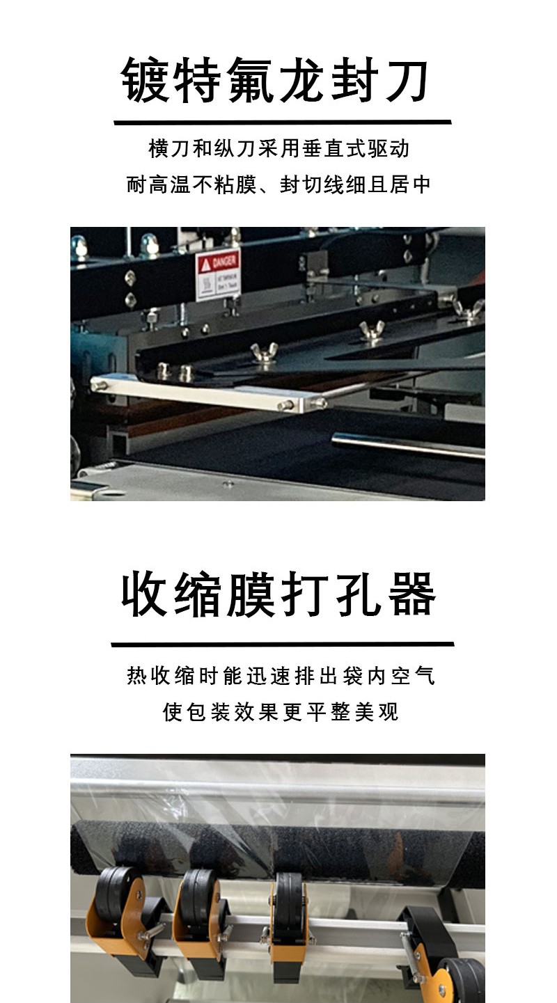 - 溫度控制精準:封切刀溫度采用數顯自動化控制,可隨意設定,封刀自身帶有自動保護功能,有效防止誤切包裝物;收縮爐內采用全封閉熱內風循環裝置,產品收縮包裝效果好,耗能低,且溫度均勻,能使收縮薄膜更好地貼合產品,達到理想的收縮包裝效果127.