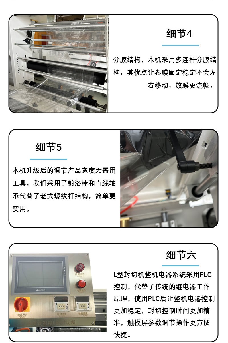 - L 型設計:L 型結構設計使得包裝機具有更小的占地空間,在保證功能完整的同時更為節省空間,適合各類工廠廠房進行布局5.