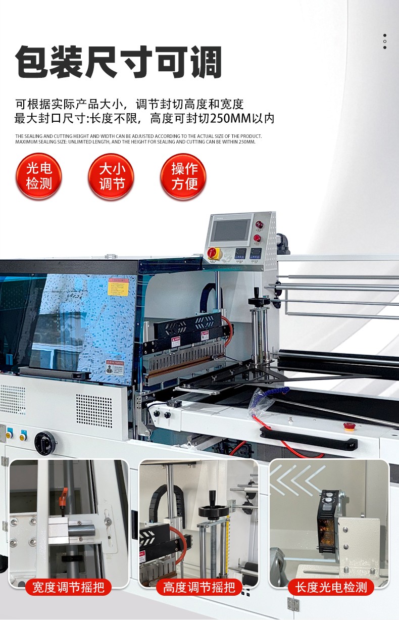 • 自動化程度高:配備 PLC 控制系統和光電感應裝置,可自動完成送膜、封口、熱收縮、出料全流程,無需人工干預。