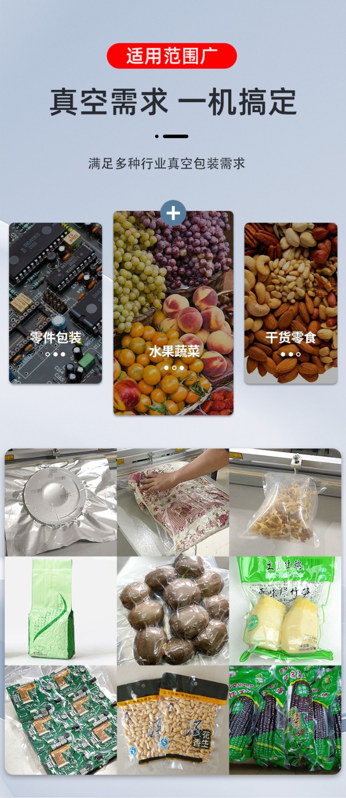 • 工業領域:可真空包裝大型機械零件(防銹)、整箱電子元件(防塵),部分機型支持調節抽真空力度,避免損壞精密組件。