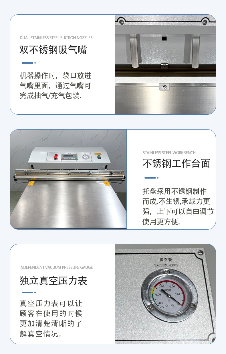 • 真空度與速度:確認設備的極限真空度(通常 - 0.08~-0.095MPa 為宜)和包裝速度(每分鐘 1-3 件,視物品大小而定),避免因性能不足影響效率。