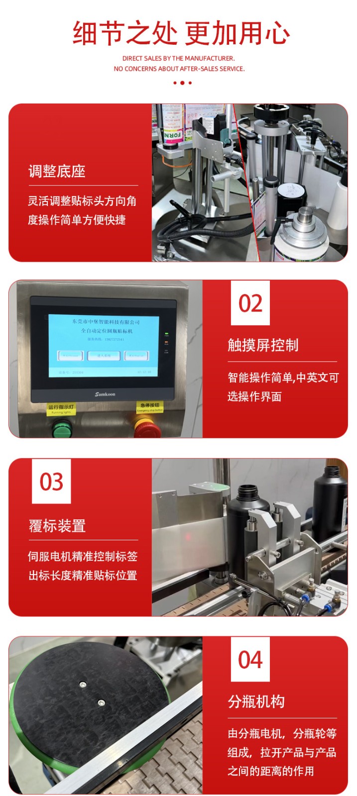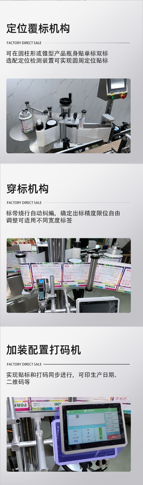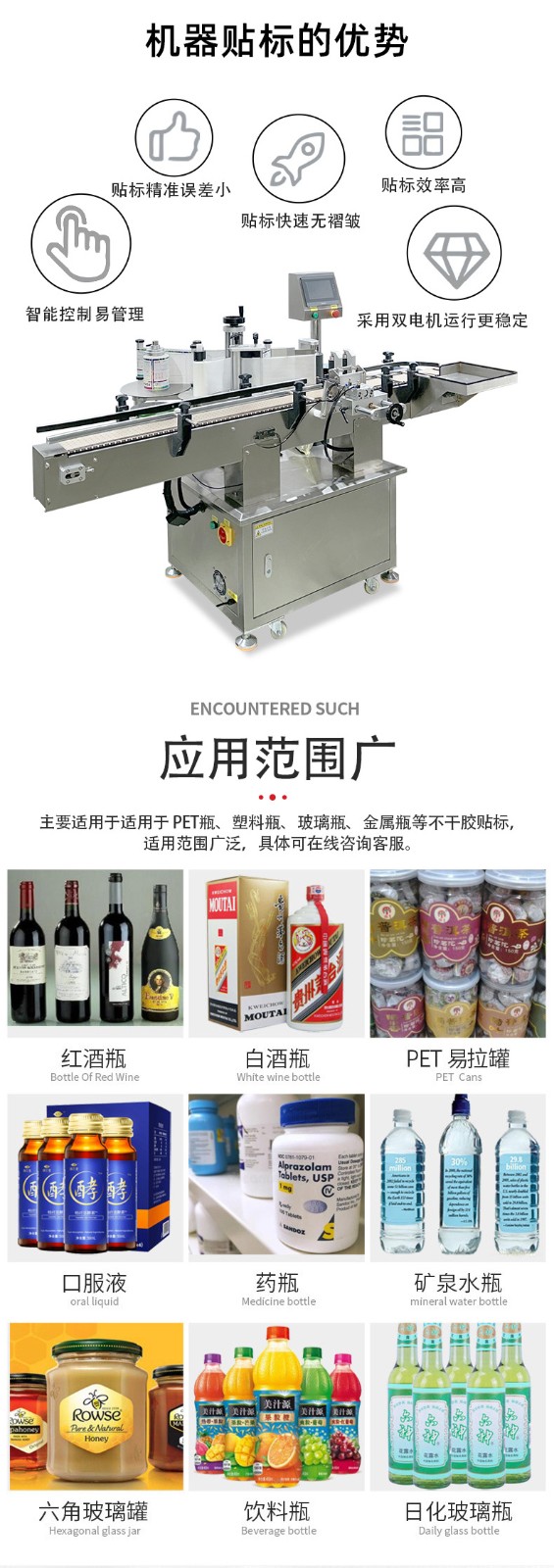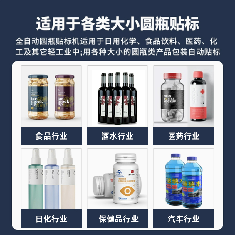 圓瓶類產品的貼標,可貼單標和雙標,正背雙標間距可靈活調整,部分機型還具備錐形瓶貼標功能。精準定位、高效智能、靈活兼容與合規耐用,可顯著提升產線自動化與貼標良率。