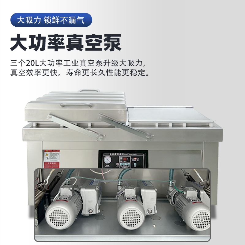- 交替作業,效率提升 50% 以上雙室機型的兩個真空室可實現 “一工一備”:當其中一個真空室正在進行抽真空、熱封作業時,操作人員可以在另一個真空室完成物料擺放、袋口整理的準備工作。單室機型則必須等抽真空 - 熱封 - 開蓋取件整個流程結束后,才能進行下一批物料的擺放,存在明顯的操作等待空窗期。同等規格下,雙室機的單位時間包裝量是單室機的 1.5-2 倍,尤其適合中小型加工廠的連續批量生產。