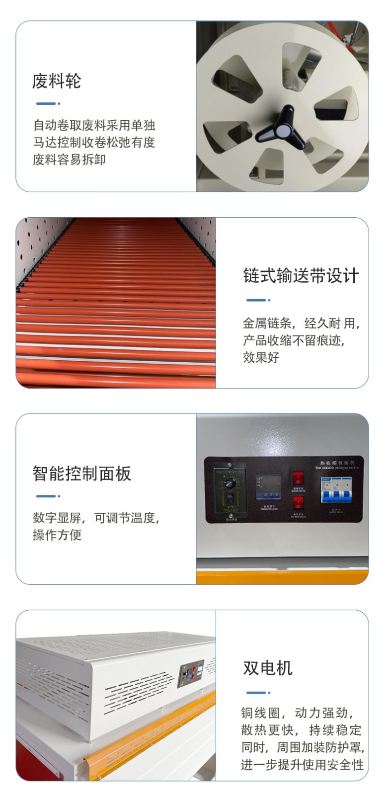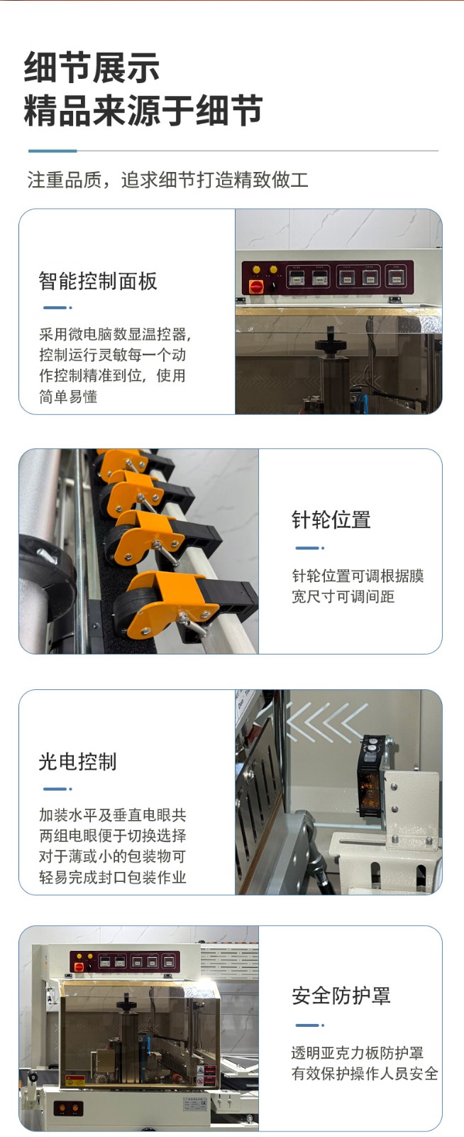 全自動邊封熱收縮機(jī)的控制系統(tǒng)是整個設(shè)備的 “大腦”,它負(fù)責(zé)協(xié)調(diào)和控制各個部件的運行,以實現(xiàn)高效、精準(zhǔn)的包裝過程。以下是對其控制系統(tǒng)的詳細(xì)介紹: 硬件組成 PLC 控制器 核心運算與控制:PLC(可編程邏輯控制器)是控制系統(tǒng)的核心部件。它接收來自各個傳感器的信號,如產(chǎn)品到位傳感器、薄膜檢測傳感器等,根據(jù)預(yù)設(shè)的程序進(jìn)行邏輯運算和處理,并向各個執(zhí)行元件發(fā)送控制指令,如驅(qū)動電機(jī)、氣動元件等,以精確控制送料、套膜、封切和熱收縮等各個包裝工序的執(zhí)行順序和時間。 穩(wěn)定性與可靠性:具有高可靠性,能在惡劣的工業(yè)環(huán)境下穩(wěn)定工作,抗干擾能力強,可確保設(shè)備長時間連續(xù)運行而不出現(xiàn)故障,保證包裝過程的穩(wěn)定性和一致性。 觸摸屏 人機(jī)交互界面:觸摸屏作為人機(jī)交互的窗口,為操作人員提供了直觀、便捷的操作平臺。操作人員可以通過觸摸屏幕輕松設(shè)置各種包裝參數(shù),如封切時間、收縮溫度、輸送速度等。同時,觸摸屏還能實時顯示設(shè)備的運行狀態(tài),如當(dāng)前工作模式、各部件的運行參數(shù)、故障報警信息等,方便操作人員隨時了解設(shè)備運行情況并及時進(jìn)行調(diào)整和維護(hù)。 參數(shù)設(shè)置與存儲:支持多種參數(shù)的設(shè)置和存儲,可根據(jù)不同的產(chǎn)品包裝需求,預(yù)設(shè)多個包裝方案,操作人員只需在觸摸屏上選擇相應(yīng)的方案,即可快速切換設(shè)備的工作參數(shù),無需重新逐一設(shè)置,大大提高了工作效率。此外,觸摸屏還具備密碼保護(hù)功能,可防止非授權(quán)人員隨意修改參數(shù),確保設(shè)備運行的安全性和穩(wěn)定性。 軟件功能 參數(shù)設(shè)置與調(diào)整功能 精確控制:通過控制系統(tǒng)的軟件,能夠精確設(shè)置和調(diào)整封切時間、收縮溫度、輸送速度等關(guān)鍵參數(shù)。例如,封切時間可以精確到毫秒級,收縮溫度可在一定范圍內(nèi)以較小的溫度梯度進(jìn)行調(diào)整,輸送速度也能根據(jù)產(chǎn)品尺寸和包裝要求進(jìn)行精確設(shè)定,從而保證不同產(chǎn)品都能獲得理想的包裝效果。 自動調(diào)節(jié)與優(yōu)化:部分先進(jìn)的控制系統(tǒng)還具備自動調(diào)節(jié)功能,能夠根據(jù)預(yù)設(shè)的包裝質(zhì)量標(biāo)準(zhǔn),自動對參數(shù)進(jìn)行微調(diào)優(yōu)化。例如,在熱收縮過程中,系統(tǒng)可根據(jù)熱收縮膜的收縮情況,自動調(diào)整加熱溫度和風(fēng)機(jī)風(fēng)速,以確保熱收縮膜均勻收縮,緊密貼合產(chǎn)品表面。 運行監(jiān)控與故障診斷功能 實時監(jiān)控:控制系統(tǒng)實時監(jiān)控設(shè)備各個部件的運行狀態(tài),包括電機(jī)的轉(zhuǎn)速、加熱元件的溫度、氣動元件的壓力等。通過傳感器將這些實時數(shù)據(jù)反饋給 PLC 控制器,再由觸摸屏以圖形化界面的形式展示給操作人員,使操作人員能夠直觀地了解設(shè)備的運行情況。 故障診斷與報警:一旦檢測到設(shè)備出現(xiàn)異常情況,如溫度過高、電機(jī)過載、薄膜供應(yīng)不足等,控制系統(tǒng)會立即進(jìn)行故障診斷,并在觸摸屏上顯示詳細(xì)的故障信息和報警提示。同時,系統(tǒng)還會自動記錄故障發(fā)生的時間、位置和相關(guān)參數(shù),以便維修人員快速定位和排除故障。有些控制系統(tǒng)還具備遠(yuǎn)程監(jiān)控和報警功能,可通過網(wǎng)絡(luò)將故障信息發(fā)送給相關(guān)人員的手機(jī)或電腦,實現(xiàn)及時響應(yīng)和處理。 生產(chǎn)數(shù)據(jù)統(tǒng)計與管理功能 數(shù)據(jù)統(tǒng)計:控制系統(tǒng)能夠自動統(tǒng)計生產(chǎn)過程中的各種數(shù)據(jù),如包裝數(shù)量、生產(chǎn)速度、設(shè)備運行時間、故障停機(jī)時間等。這些數(shù)據(jù)對于企業(yè)的生產(chǎn)管理和質(zhì)量控制具有重要意義,可幫助企業(yè)分析生產(chǎn)效率、評估設(shè)備性能、制定生產(chǎn)計劃和進(jìn)行成本核算。 數(shù)據(jù)存儲與查詢:生產(chǎn)數(shù)據(jù)可存儲在控制系統(tǒng)的內(nèi)存或外部存儲設(shè)備中,方便操作人員隨時查詢和調(diào)用。同時,數(shù)據(jù)還可通過網(wǎng)絡(luò)接口導(dǎo)出到計算機(jī)或企業(yè)的生產(chǎn)管理系統(tǒng)中,以便進(jìn)行進(jìn)一步的分析和處理,為企業(yè)的決策提供數(shù)據(jù)支持。 通信與聯(lián)網(wǎng)功能 內(nèi)部通信:控制系統(tǒng)通過內(nèi)部通信總線實現(xiàn)各個硬件模塊之間的高速數(shù)據(jù)傳輸和通信,確保 PLC 控制器、觸摸屏、傳感器和執(zhí)行元件等之間的信息交互準(zhǔn)確、及時,從而實現(xiàn)設(shè)備各部件的協(xié)同工作。 外部聯(lián)網(wǎng):一些高端的全自動邊封熱收縮機(jī)控制系統(tǒng)支持外部聯(lián)網(wǎng)功能,可通過以太網(wǎng)、WiFi 等方式與企業(yè)的生產(chǎn)管理系統(tǒng)或其他設(shè)備進(jìn)行聯(lián)網(wǎng)通信。這樣,企業(yè)可以實現(xiàn)對多臺設(shè)備的集中監(jiān)控和管理,優(yōu)化生產(chǎn)流程,提高生產(chǎn)效率和管理水平。例如,在一個大規(guī)模的包裝生產(chǎn)線上,通過聯(lián)網(wǎng)功能可以將多臺熱收縮機(jī