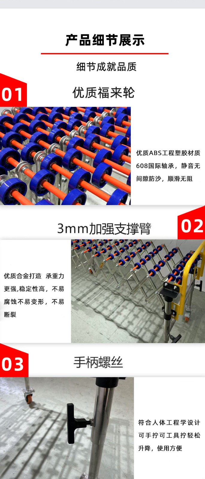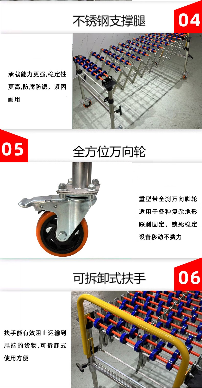 • 滾輪:這是核心部件,一般由金屬或塑料制成。金屬滾輪(如碳鋼、不銹鋼滾輪)具有較高的強度和承載能力,適用于較重物品的輸送;塑料滾輪(如聚氨酯滾輪)則具有較好的耐磨性和較低的噪音特性,常用于對噪音要求較高的場合。滾輪的直徑和寬度會根據輸送物品的大小和重量等因素來選擇。