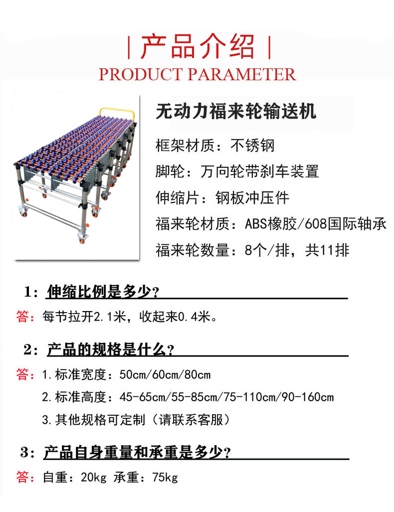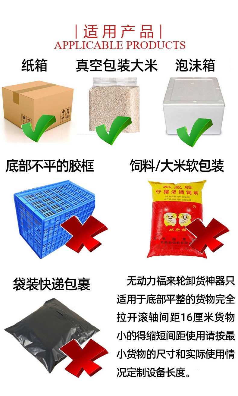 • 在無動力滾輪輸送機中,當物品放置在滾輪上時,利用物品自身的重力在傾斜的輸送機上產生下滑分力,或者通過人工施加外力,使物品與滾輪之間產生相對運動。由于滾輪可以自由旋轉,物品就在滾輪的滾動下向前移動。