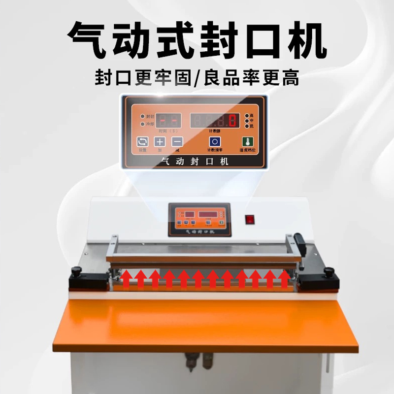 - 封口原理:通過氣動裝置產(chǎn)生壓力,將待包裝物品的塑料薄膜袋口部位壓緊,然后利用加熱元件對袋口進(jìn)行加熱,使薄膜受熱熔化,在壓力作用下實(shí)現(xiàn)封口。