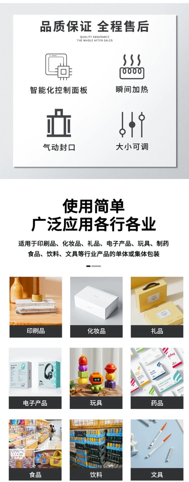 - 適應(yīng)性強(qiáng):可根據(jù)不同的產(chǎn)品尺寸、形狀和包裝要求,調(diào)整封口、切角和熱收縮的相關(guān)參數(shù),適應(yīng)多種規(guī)格的塑料薄膜包裝材料,廣泛應(yīng)用于食品、飲料、醫(yī)藥、日用品、電子等行業(yè)的產(chǎn)品包裝。