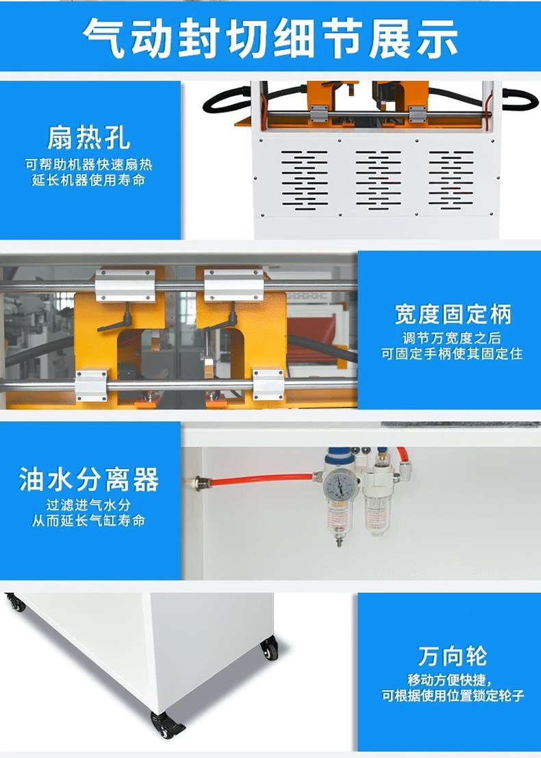 - 封口質(zhì)量好:通過精確控制氣動壓力和加熱溫度、時間,能夠保證封口處的薄膜熔接牢固、平整,封口強(qiáng)度高,不易出現(xiàn)漏包現(xiàn)象。