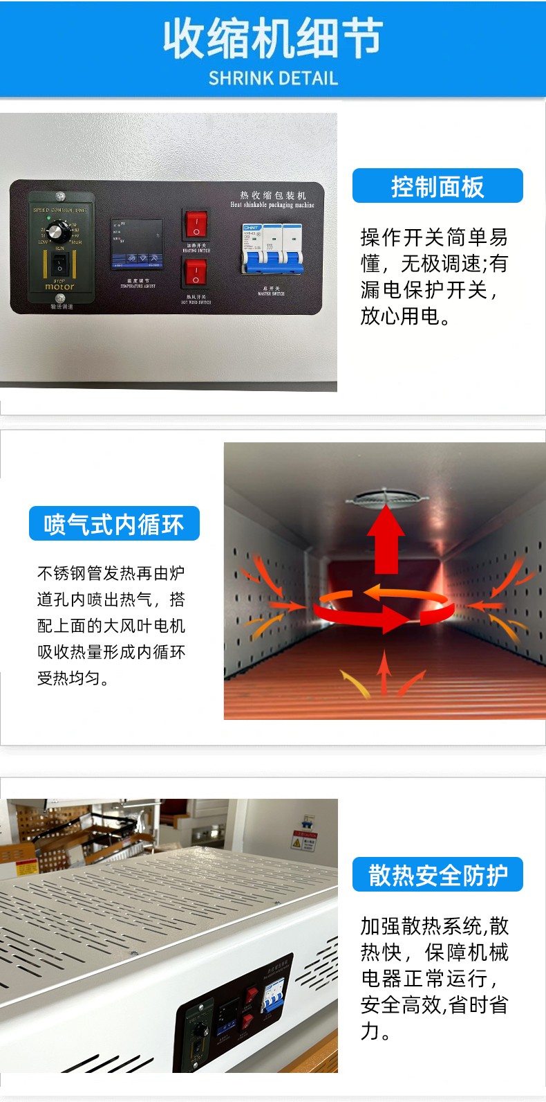 - 熱收縮效果佳:熱收縮通道內(nèi)的溫度分布均勻,熱風(fēng)循環(huán)系統(tǒng)設(shè)計(jì)合理,可使塑料薄膜均勻收縮,緊密貼合產(chǎn)品,展現(xiàn)產(chǎn)品的外觀特征,同時起到防潮、防塵、防碰撞等保護(hù)作用。