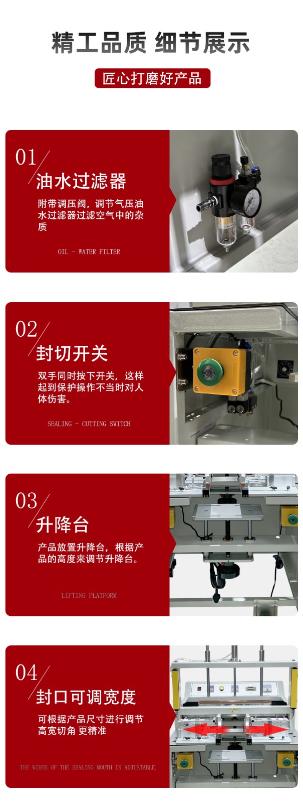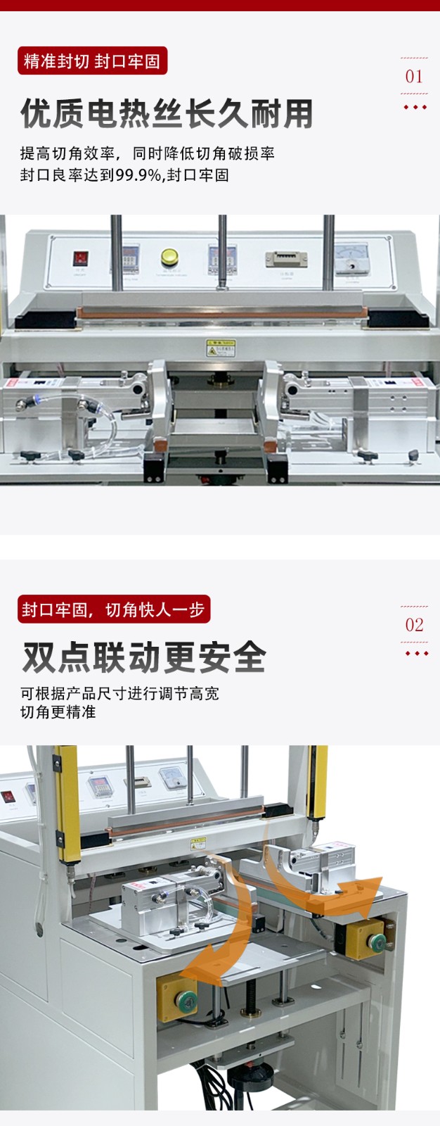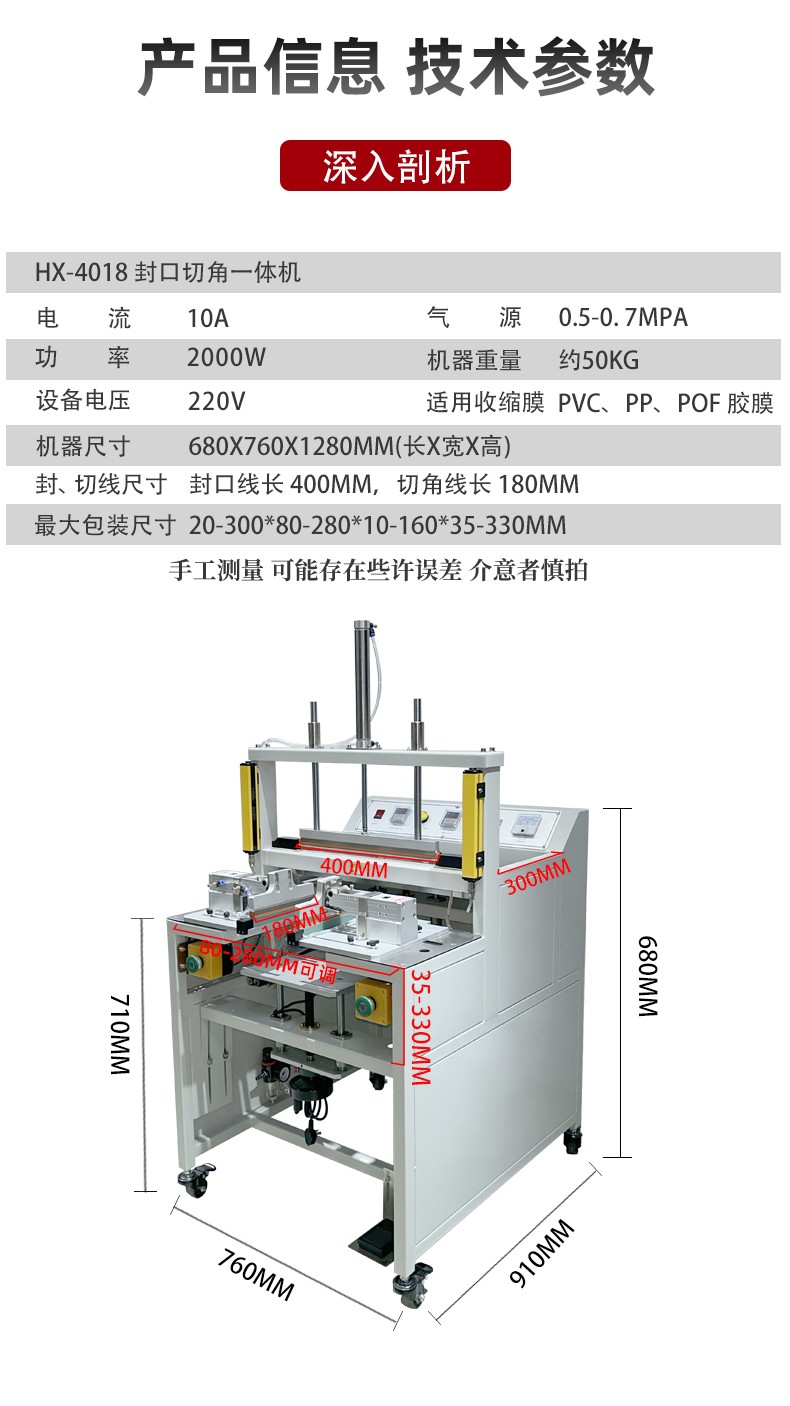 • 高效自動化:能自動完成封口和切角工序,大大提高生產效率,減少人工成本4
