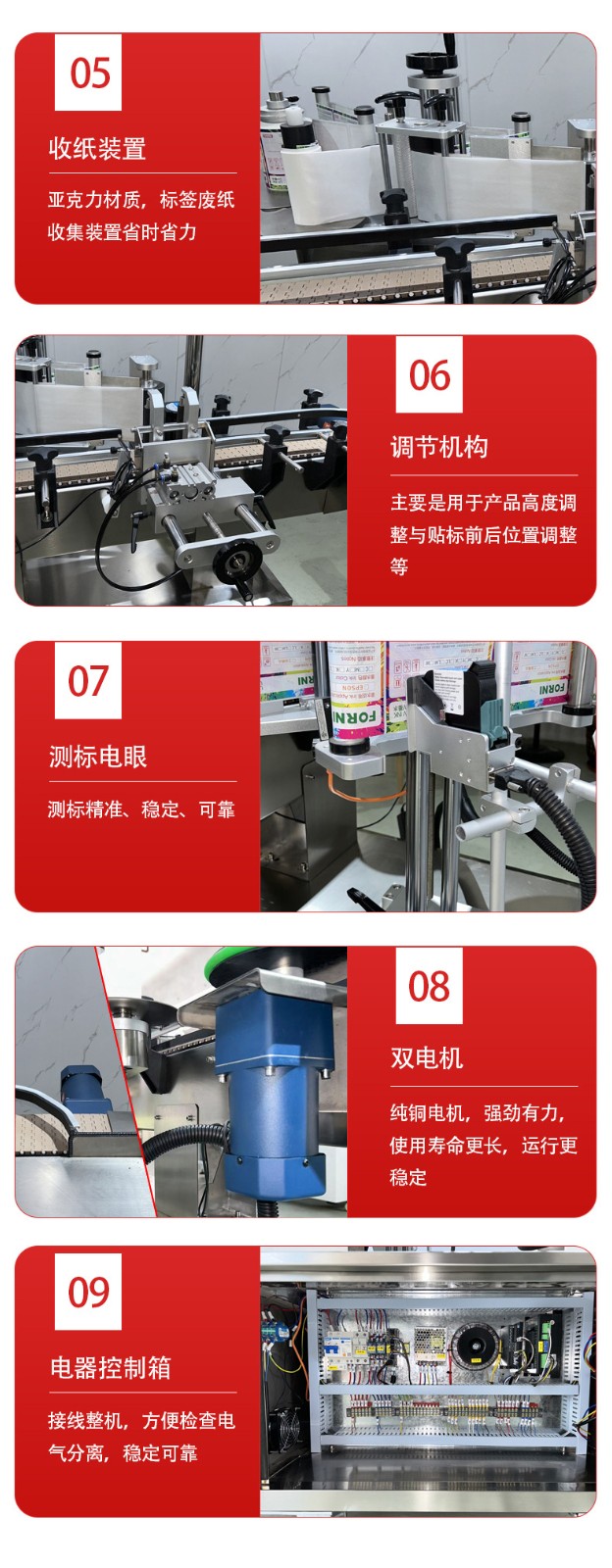 - 貼標機構:主要包括標簽放卷裝置、標簽牽引裝置、貼標頭和壓標裝置等。標簽放卷裝置用于放置標簽卷,能自動放卷并保持標簽的張力穩定。標簽牽引裝置通過電機驅動,精確控制標簽的輸送長度和速度,使其與圓瓶的輸送速度相匹配。貼標頭采用高精度的機械結構和氣動元件,能準確地將標簽貼附在圓瓶表面,并且可以根據圓瓶的直徑和貼標位置進行調整。壓標裝置在標簽貼附后,對標簽進行壓實,確保標簽與瓶身緊密貼合,無氣泡或皺褶。